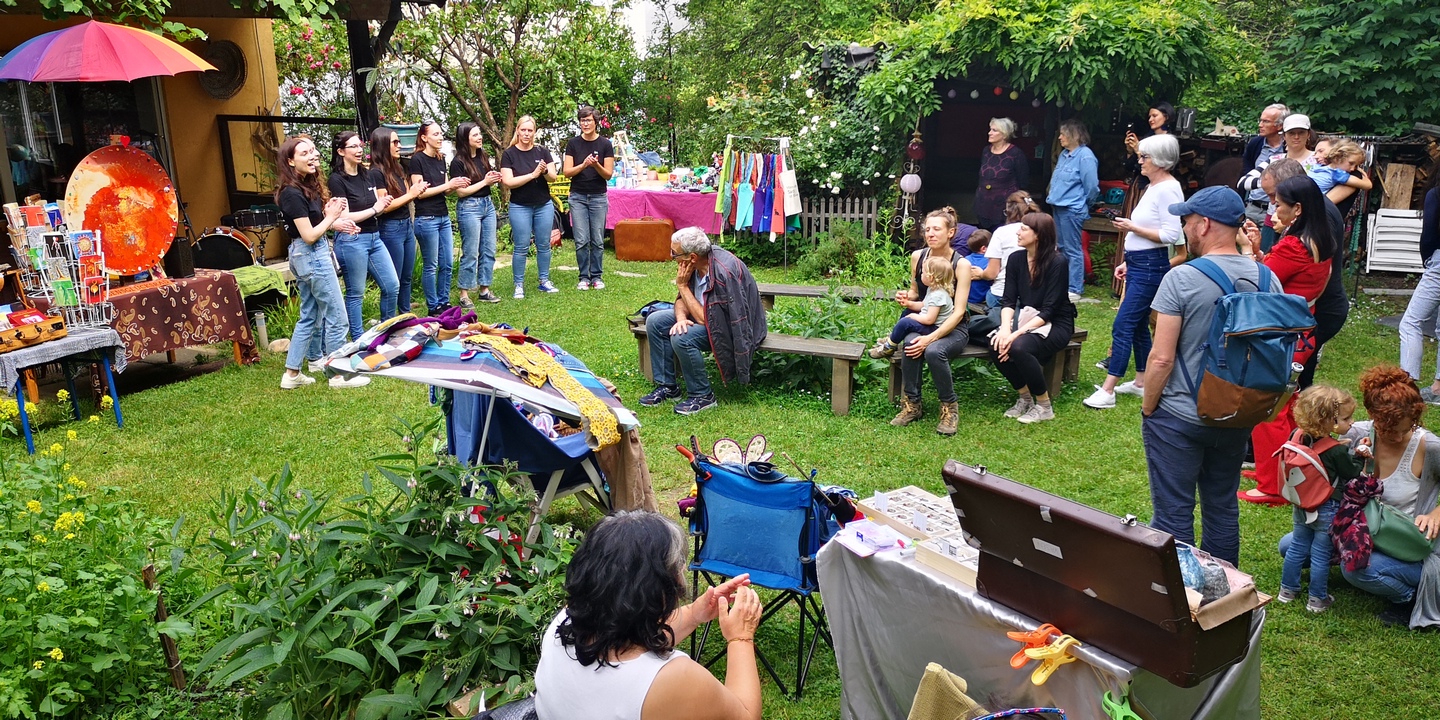 Es gibt eine open stage (=Bühne) für Musikbeiträge, Lesungen oder Performances. (Zweck Planung bitte anmelden, siehe unten).