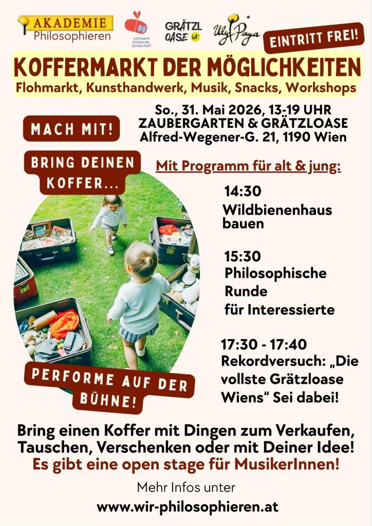 17:30 Rekordversuch für „Die vollste Grätzloase Wiens“: Wie viele Menschen passen in die Lebensfragenoase? Die Grätzeloase steht vor der Akademie statt zwei Autoparkplätzen, dient SchülerInnen und Eltern als Rastplatz und und erobert den öffentlichen Raum zurück für alle. Mach mit!